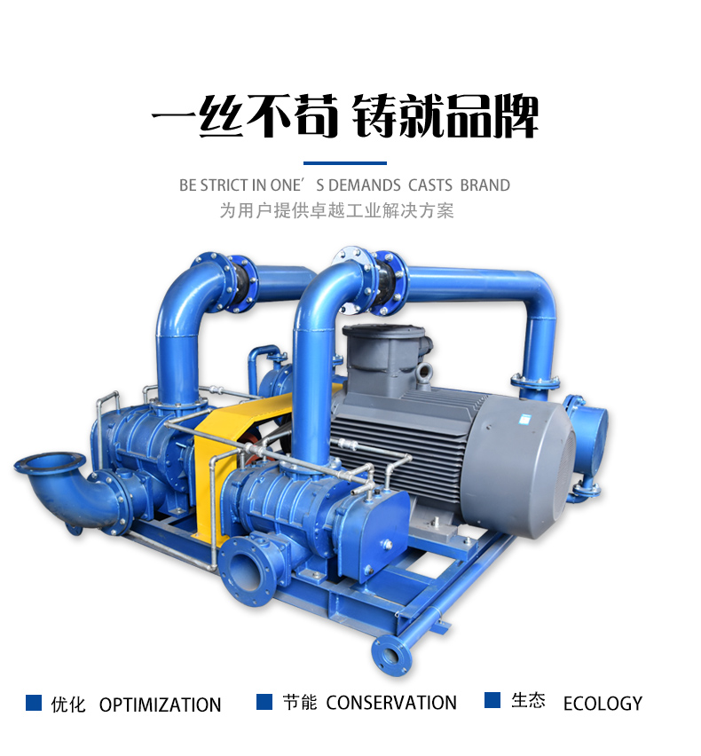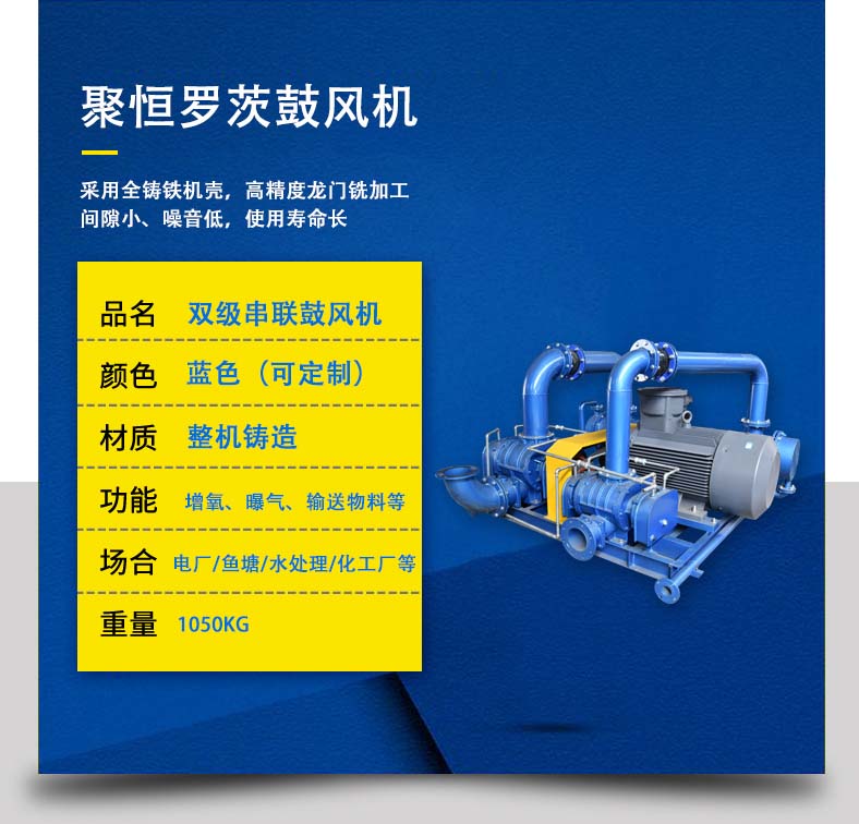 雙級串聯羅獲風機是由兩臺羅獲鼓風機串聯而成。當氣體進入第一級風機升壓后,經過中間冷卻器將氣體溫度降至40℃以下,然后進入二級風機繼續升壓,機組最高升壓可達177kPa。兩級風機的主機由同一臺電機通過皮帶傳動或雙軸伸電機直聯傳動。